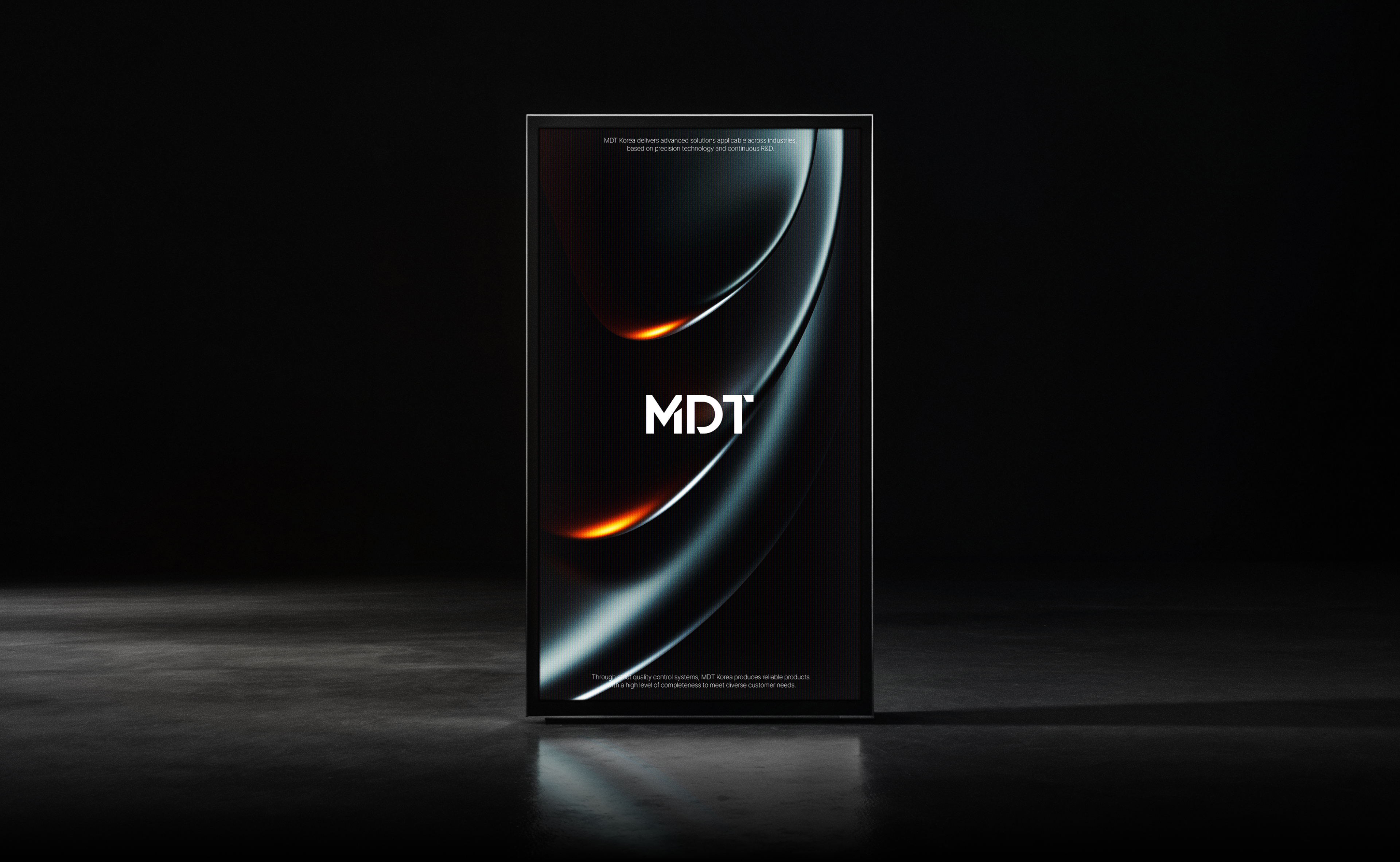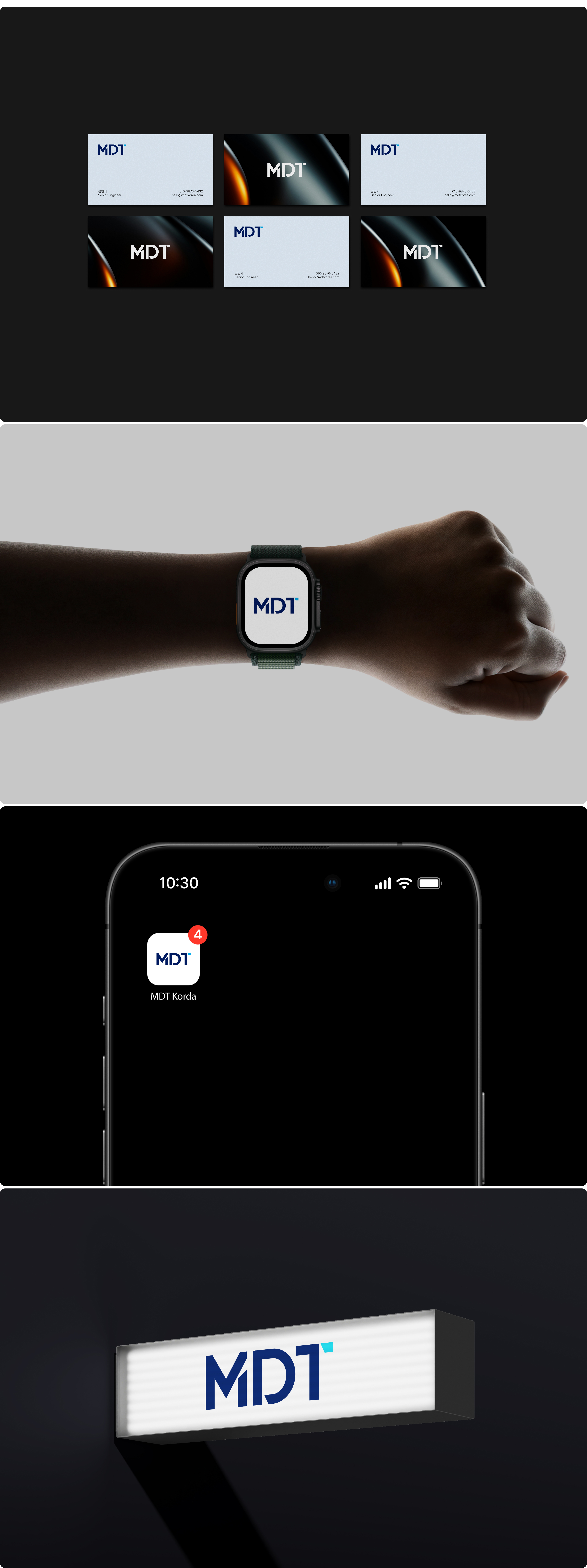 MDT 로고는 간결한 조형과 정제된 타이포그래피를 기반으로, 기술 중심 기업의 신뢰성과 전문성을 시각적으로 전달하고자 디자인하였습니다. 로고는 이니셜 ‘MDT’를 중심으로 구성하여 브랜드의 정체성을 직관적으로 인식할 수 있도록 하였으며, 불필요한 요소를 배제한 미니멀한 형태를 통해 현대적이고 세련된 이미지를 강조하였습니다. 특히, 일부 획의 절개와 구조적 변형을 통해 기술적이고 정교한 이미지를 부여하였으며, 포인트 컬러를 활용한 디테일 요소는 혁신성과 확장성을 상징적으로 표현합니다. 한글 로고타입은 영문 로고와 동일한 조형 원리를 적용하여 일관된 브랜드 아이덴티티를 유지하였으며, 견고한 구조와 균형 잡힌 비율을 통해 가독성과 안정감을 동시에 확보하였습니다.