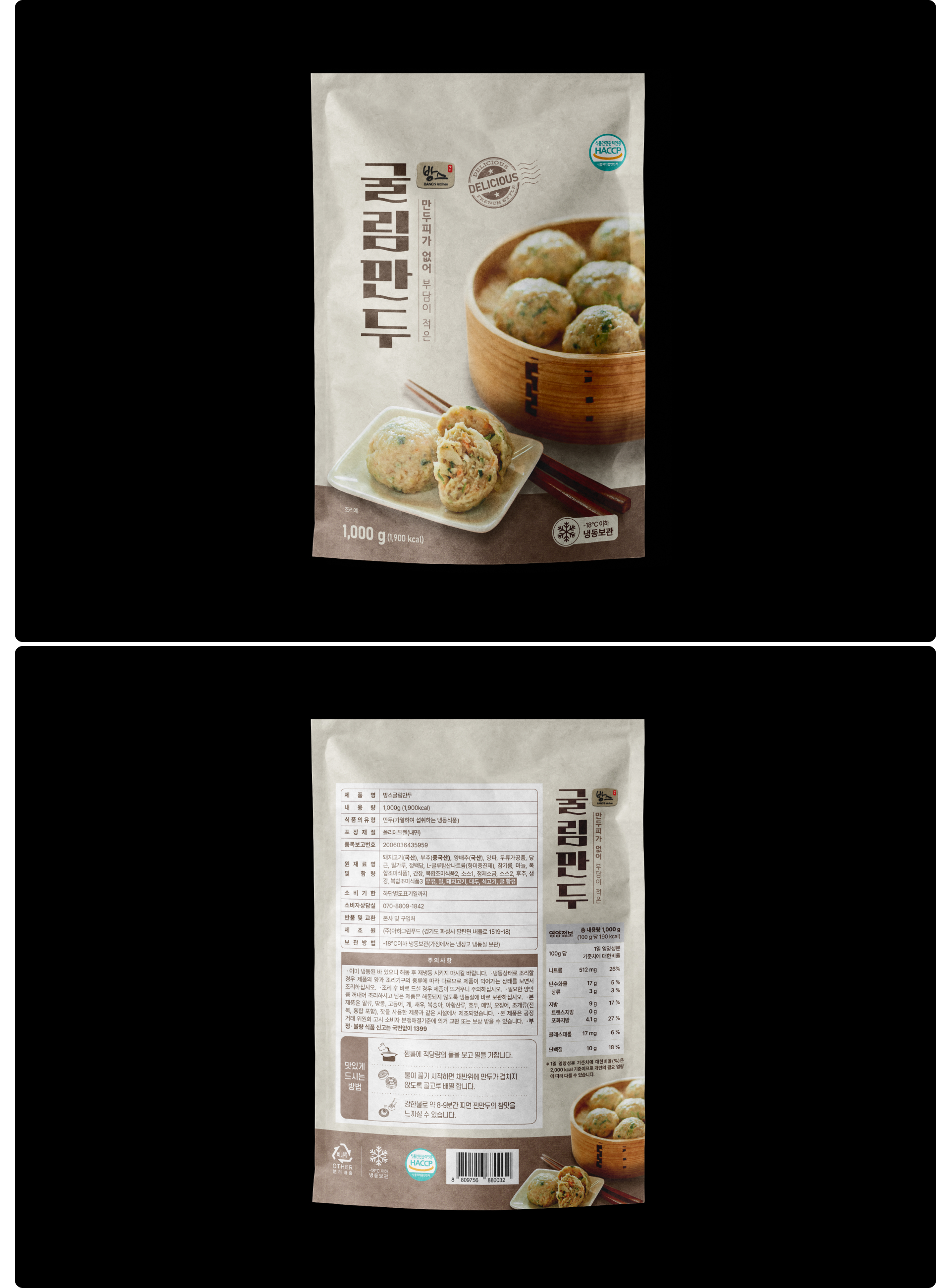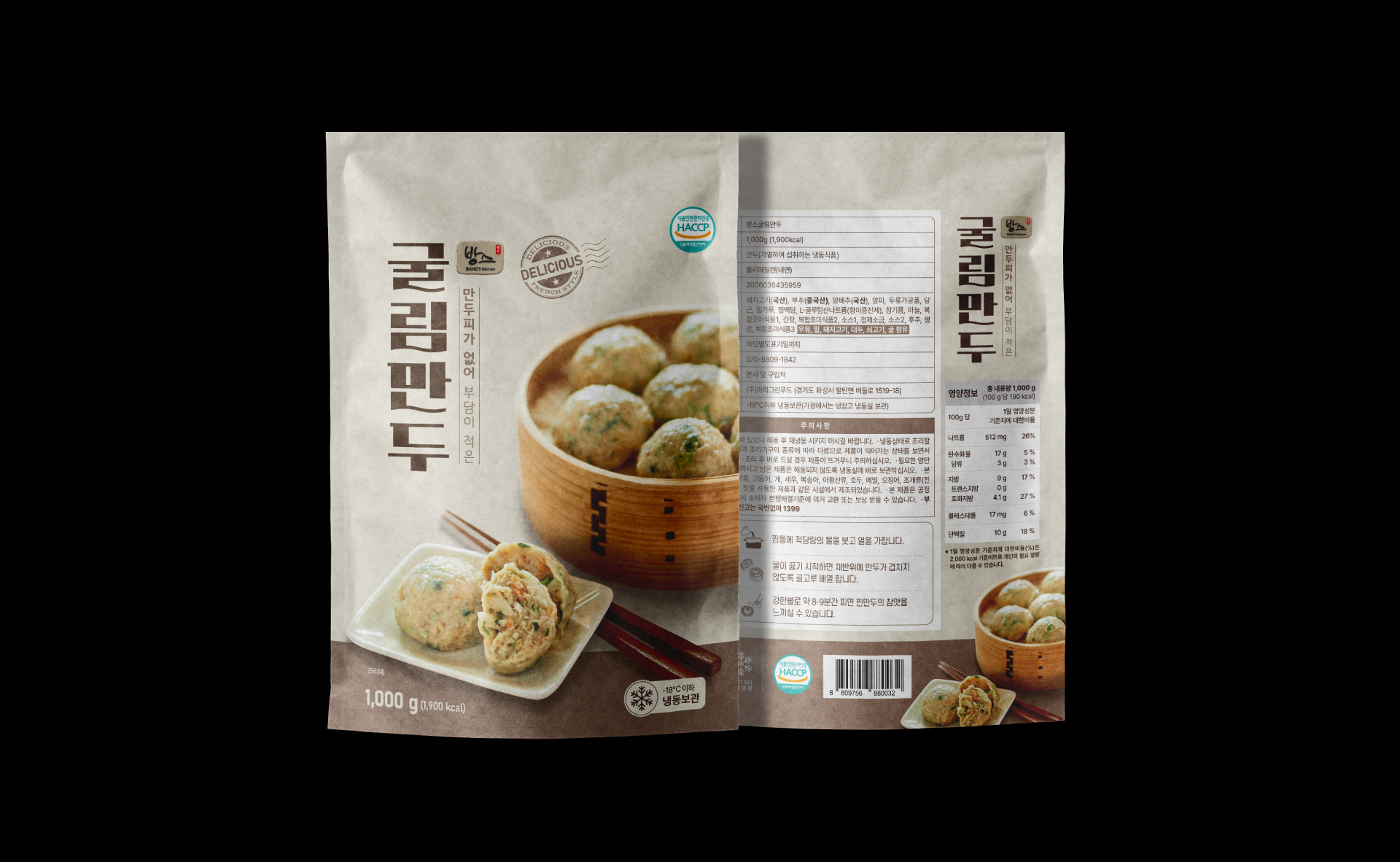 아하푸드의 굴림만두 패키지 디자인은 전통의 맛과 현대적인 감성을 조화롭게 담아내는 데 중점을 두었습니다. 상단의 화이트 배경과 하단의 브라운 컬러 배색을 대비시켜 깔끔하면서도 따뜻한 이미지를 형성하였으며, 깊은 풍미를 연상시키는 컬러 톤으로 제품의 정체성을 직관적으로 전달합니다. 중앙에는 제품명을 굵고 안정감 있는 타이포그래피로 배치하여 시인성을 높였고, 제품에 대한 신뢰감을 강화하였습니다.