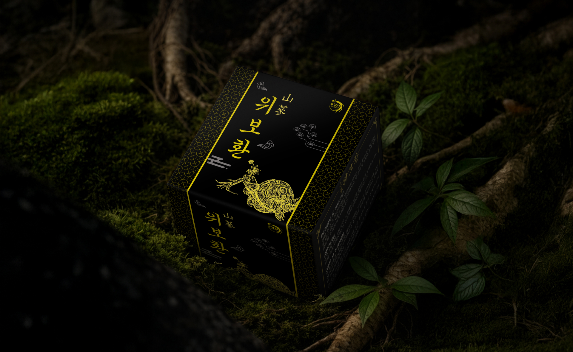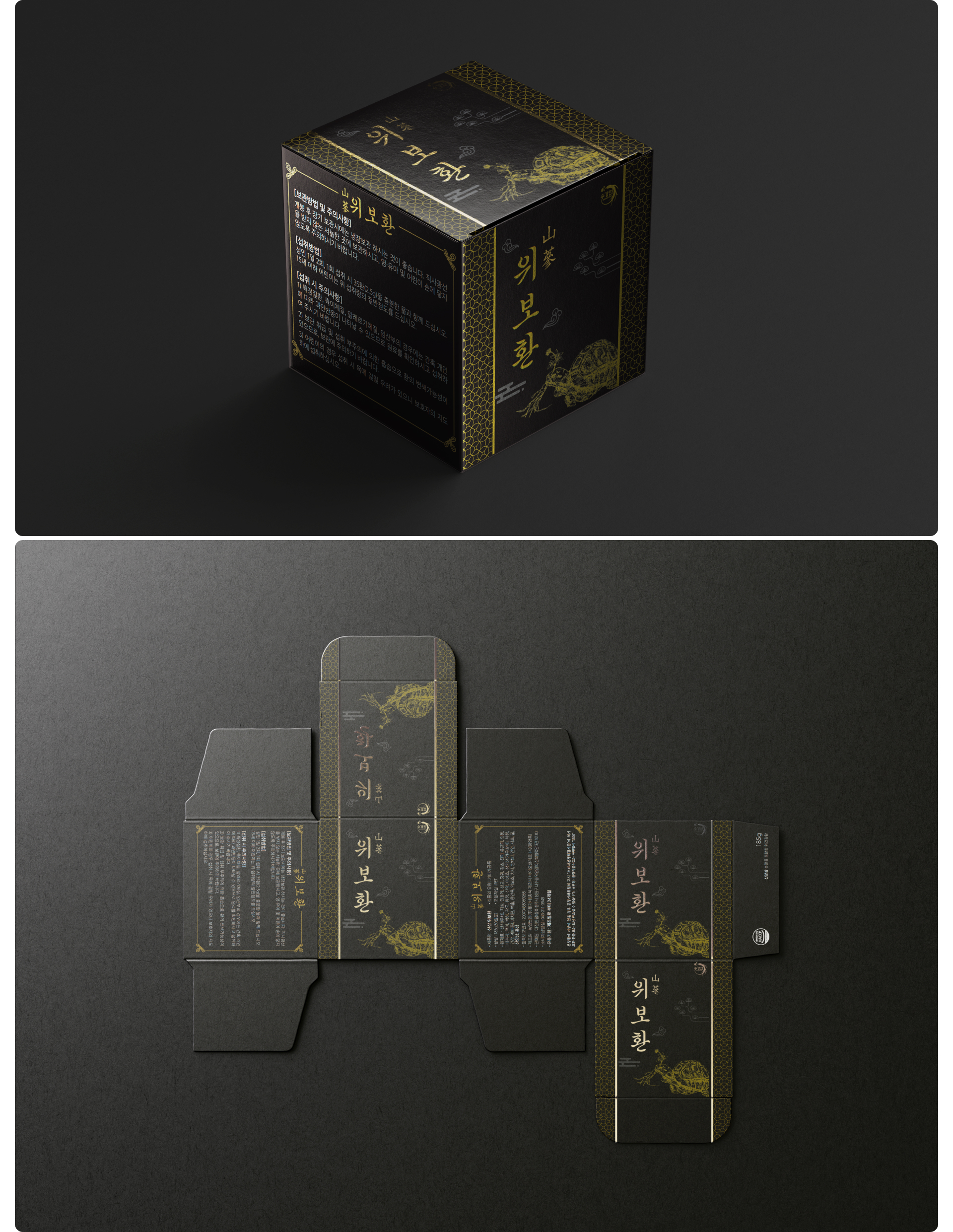 위보환 패키지 디자인은 전통 한방의 깊이와 신뢰감을 현대적으로 재해석하는 데 중점을 두었습니다. 전체적으로 블랙 컬러를 메인으로 사용하여 제품의 프리미엄 이미지를 강조하였으며, 골드 포인트 그래픽과 한방 원료 일러스트를 더해 고급스럽고 상징적인 인상을 전달합니다. 전면의 세로형 서체 구성은 전통 한약 패키지의 정체성을 살리면서도 정돈된 레이아웃으로 가독성을 높였습니다. 측면에는 제품 정보와 효능 설명을 체계적으로 배치하여 신뢰성과 전문성을 강화하였고, 패턴 디테일을 적용해 단조로움을 줄이면서 브랜드 아이덴티티를 완성하였습니다. 박스 전개도 기준으로도 그래픽 요소가 자연스럽게 이어지도록 설계하여 진열 시 일관된 시각적 완성도를 유지하도록 디자인하였습니다.