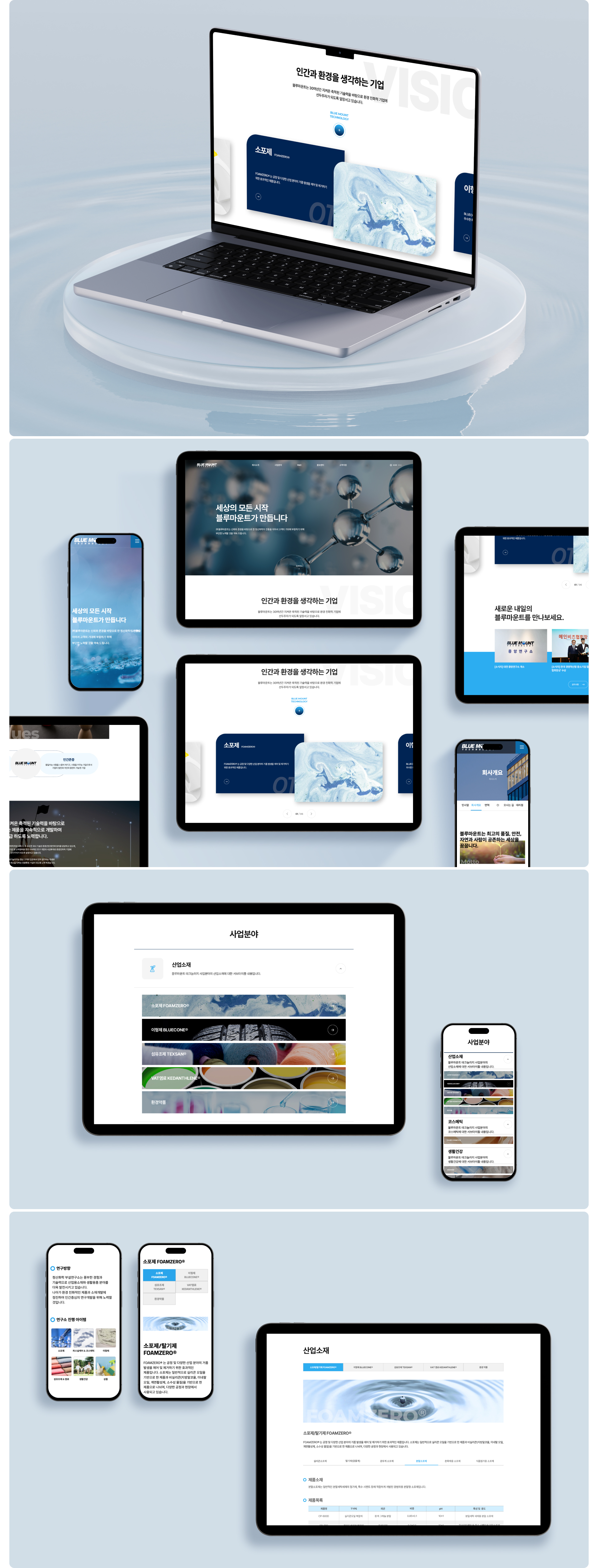 블루마운트의 홈페이지 디자인은 산업 소재 기업의 전문성과 신뢰감을 효과적으로 전달하기 위해 설계된 웹사이트입니다. 블루 톤을 중심으로 한 컬러 시스템과 간결한 레이아웃을 통해 기업의 기술 중심 이미지를 강조하고, 분자 구조 이미지를 활용한 메인 비주얼로 산업 분야의 정체성을 직관적으로 표현했습니다. 또한 사업 분야와 제품 정보를 카드형 콘텐츠와 슬라이드 구조로 구성해 사용자가 필요한 정보를 쉽게 탐색할 수 있도록 했으며, 반응형 UI를 적용해 다양한 디바이스 환경에서도 일관된 사용자 경험을 제공하도록 디자인했습니다.