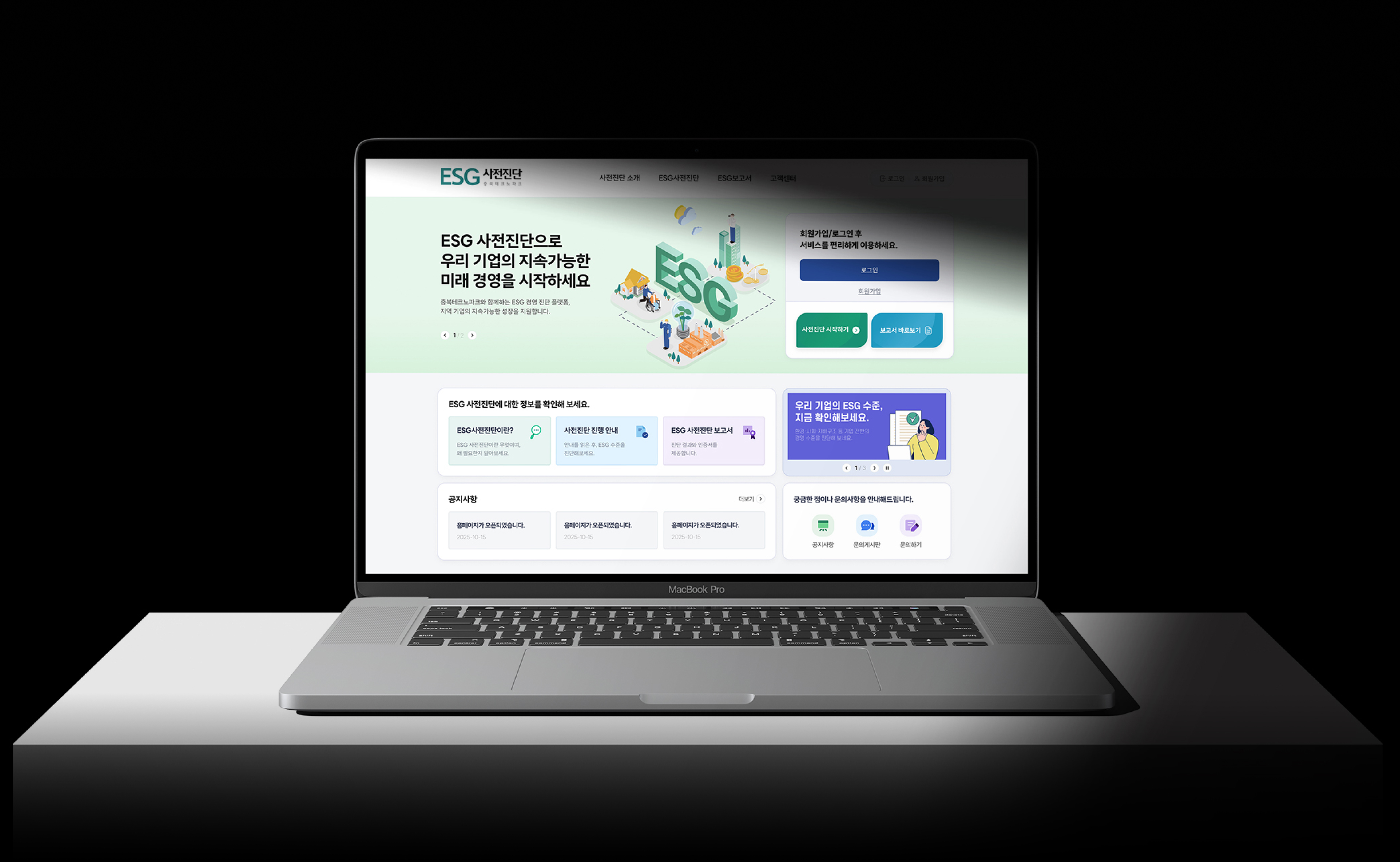 충북테크노파크 ESG 사전진단 홈페이지는 기업이 ESG 경영 수준을 사전에 점검하고 이해할 수 있도록 정보를 체계적으로 전달하는 데 중점을 두고 설계되었습니다. 메인 화면에서는 친환경과 지속가능성을 상징하는 일러스트와 컬러를 활용해 ESG의 핵심 가치를 직관적으로 표현했으며, 사용자가 서비스 목적을 쉽게 이해할 수 있도록 간결한 구조로 구성했습니다. ESG 개념 소개, 사전진단 안내, 진단 참여, 결과 확인 등 주요 기능을 단계적인 사용자 흐름에 맞춰 배치해 기업이 진단 과정을 자연스럽게 따라갈 수 있도록 설계했으며, 아이콘과 인포그래픽 요소를 활용해 복잡한 ESG 정보를 시각적으로 이해하기 쉽게 정리했습니다. 또한 그린과 블루 계열의 컬러 시스템을 중심으로 신뢰성과 공공 서비스의 이미지를 강화하고, 반응형 UI를 적용해 다양한 디바이스 환경에서도 편리하게 이용할 수 있도록 구현했습니다.