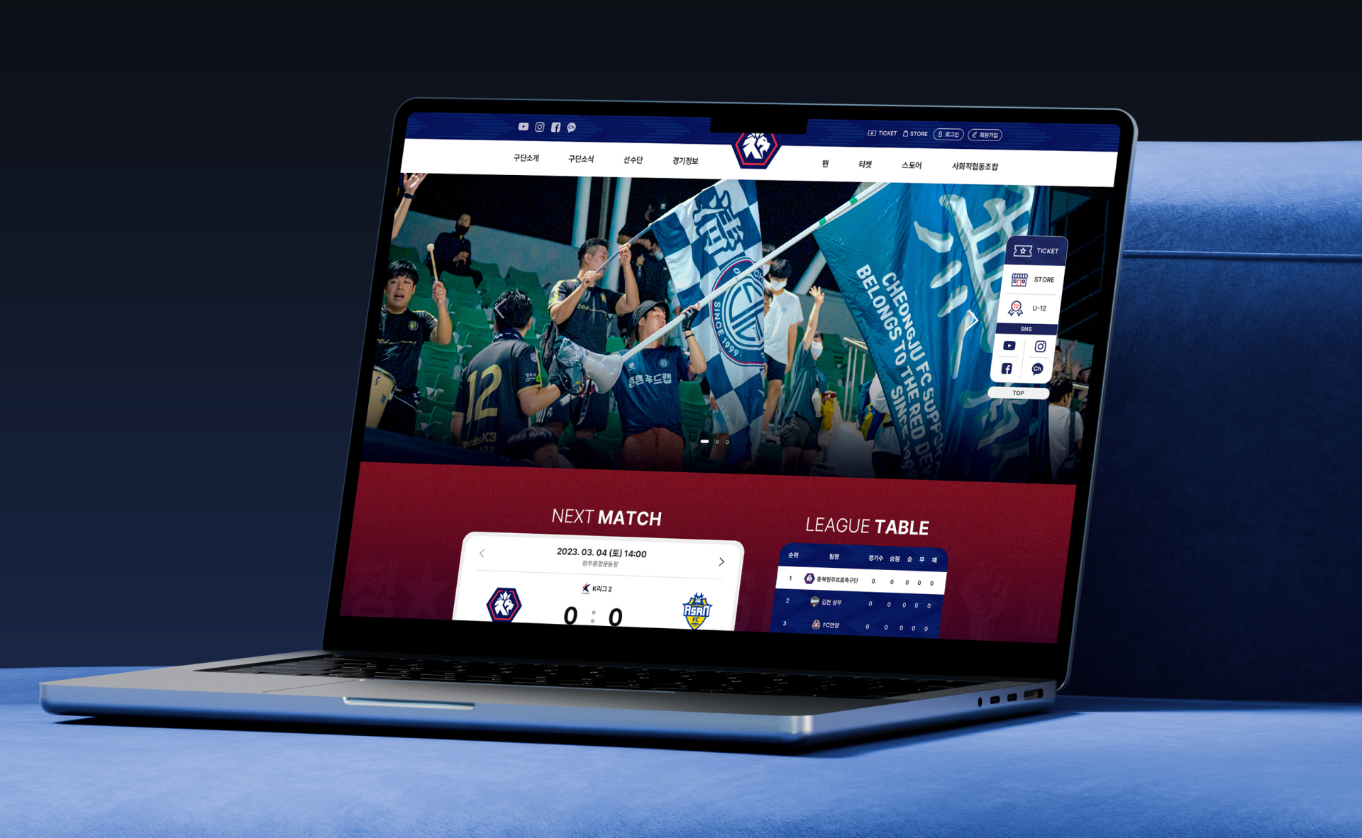 충북청주 프로축구단 홈페이지는 구단의 아이덴티티를 중심으로 역동성과 신뢰감을 동시에 전달하는 방향으로 디자인하였습니다. 메인 비주얼에는 경기장의 현장감과 팬들의 열기를 담아 브랜드 이미지를 직관적으로 인지할 수 있도록 구성하였으며, 구단 컬러를 활용한 그라데이션과 대비감 있는 레이아웃으로 스포티한 분위기를 강조하였습니다. NEXT MATCH, 리그 테이블, 뉴스, SNS 등 핵심 콘텐츠를 메인 화면에 구조적으로 배치해 정보 접근성을 높이고 사용자 흐름을 직관적으로 설계하였습니다. 또한 선수단 소개, 경기 일정·결과, 갤러리 등 다양한 콘텐츠는 일관된 UI 시스템과 카드형 레이아웃을 적용해 가독성과 확장성을 고려하였습니다. PC, 태블릿, 모바일 환경에 최적화된 반응형 구조를 적용하여 어떤 디바이스에서도 동일한 브랜드 경험을 제공하는 통합 디지털 플랫폼으로 구현하였습니다.