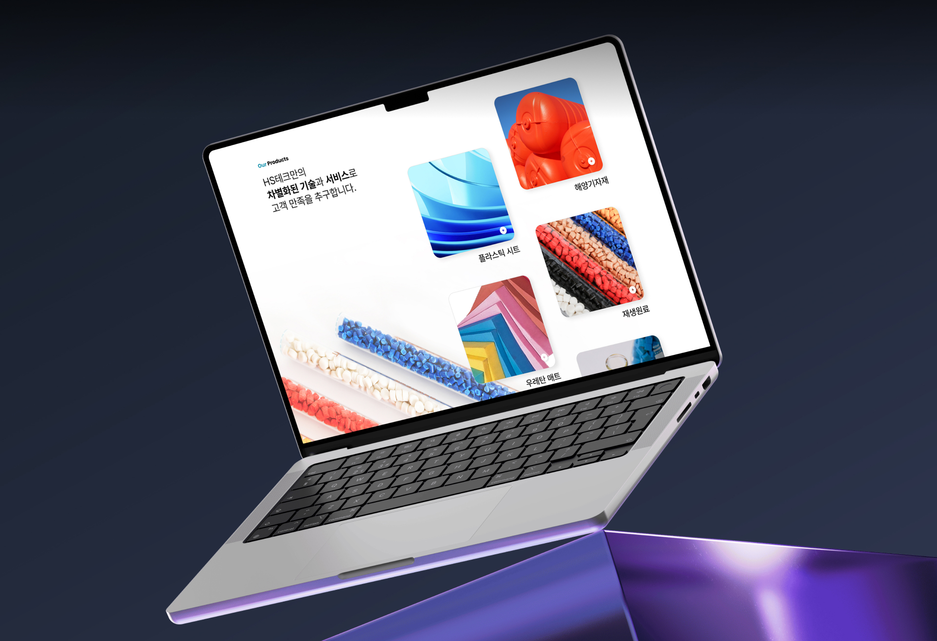 HS테크 홈페이지는 엔지니어링 플라스틱 소재 기업의 전문성과 제품 중심의 정보를 효과적으로 전달하는 데 초점을 두고 디자인되었습니다. 메인 화면은 넓은 바다와 항해하는 선박 이미지를 활용해 기업이 지향하는 글로벌 확장성과 역동적인 기업 이미지를 상징적으로 표현했으며, 블루 계열의 컬러를 중심으로 안정적이고 신뢰감 있는 브랜드 분위기를 구축했습니다. 제품 콘텐츠는 소재와 활용 분야를 직관적으로 이해할 수 있도록 카드형 구조로 구성하고, 실제 제품 이미지를 중심으로 배치해 소재의 특성과 품질을 시각적으로 전달하도록 설계했습니다. 또한 기업소개, 제품정보, 고객사, 문의 등 주요 콘텐츠를 명확한 정보 구조로 정리해 B2B 기업 사이트에서 필요한 정보를 빠르게 탐색할 수 있도록 사용자 흐름을 고려했습니다.