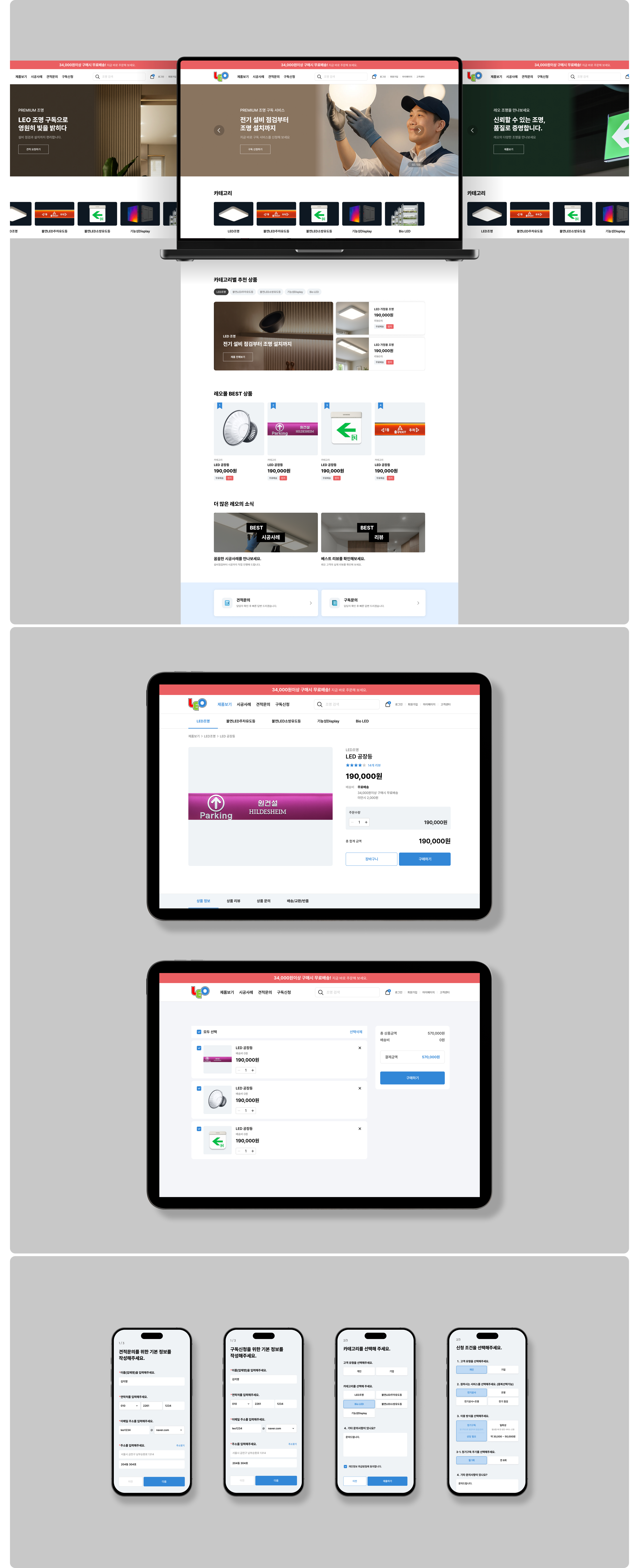 레오몰(LEO Mall)은 조명 및 전기 설비 제품을 중심으로 한 커머스 플랫폼으로, 복잡한 산업 제품 정보를 직관적으로 전달하고 빠른 구매 전환을 유도하는 데 초점을 맞춰 디자인되었습니다. 대형 비주얼 중심의 메인 구조와 명확한 카테고리 분류를 통해 사용자가 진입과 동시에 핵심 정보를 인지할 수 있도록 설계했으며, BEST 상품 및 프로모션 영역을 활용해 자연스럽게 탐색에서 구매로 이어지는 흐름을 구축했습니다. 특히 본 프로젝트에서는 고객사의 핵심 요구사항인 견적 요청 및 구독 신청 기능을 모바일 환경에서 쉽고 빠르게 완료할 수 있도록 사용자 흐름을 재설계한 것이 핵심입니다. 복잡한 입력 과정을 단계별로 단순화하고, 선택 중심의 인터페이스와 명확한 CTA 구조를 적용하여 최소한의 인터랙션으로 전환이 이루어지도록 최적화했습니다. 또한 반응형 기반의 UI 설계를 통해 다양한 디바이스에서 일관된 경험을 제공하며, 모바일 환경에서는 터치 인터랙션과 입력 편의성을 고려한 UI로 모바일 퍼스트에 가까운 사용 경험을 구현했습니다.