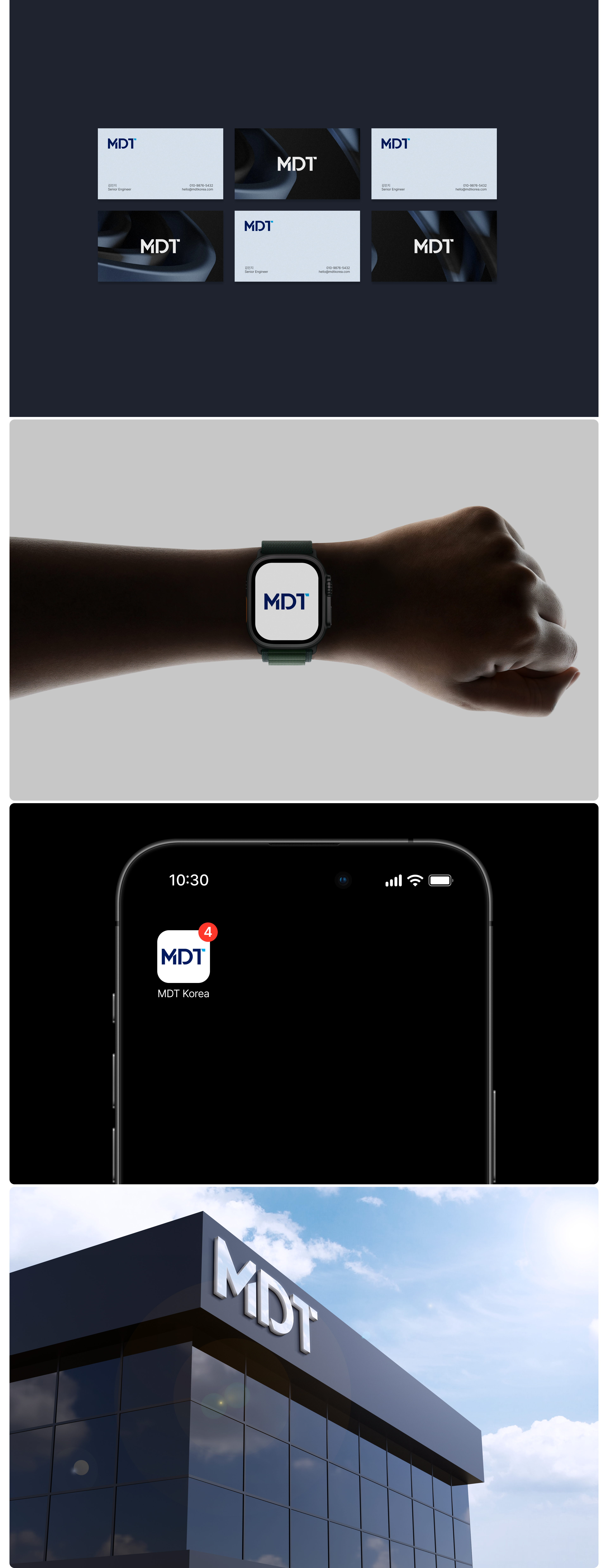 MDT 로고는 간결한 조형과 정제된 타이포그래피를 기반으로, 기술 중심 기업의 신뢰성과 전문성을 시각적으로 전달하고자 디자인하였습니다. 로고는 이니셜 ‘MDT’를 중심으로 구성하여 브랜드의 정체성을 직관적으로 인식할 수 있도록 하였으며, 불필요한 요소를 배제한 미니멀한 형태를 통해 현대적이고 세련된 이미지를 강조하였습니다. 특히, 일부 획의 절개와 구조적 변형을 통해 기술적이고 정교한 이미지를 부여하였으며, 포인트 컬러를 활용한 디테일 요소는 혁신성과 확장성을 상징적으로 표현합니다. 한글 로고타입은 영문 로고와 동일한 조형 원리를 적용하여 일관된 브랜드 아이덴티티를 유지하였으며, 견고한 구조와 균형 잡힌 비율을 통해 가독성과 안정감을 동시에 확보하였습니다.