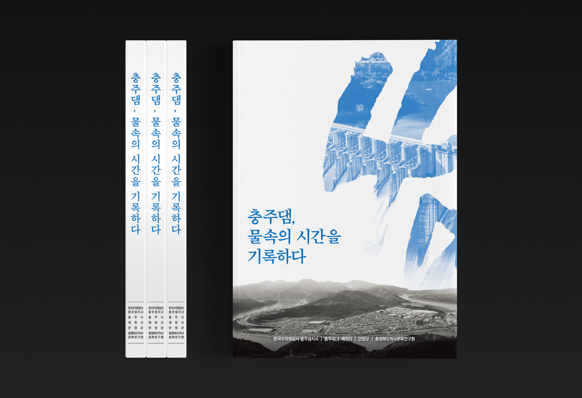 「충추댐 준공40주년기념 대중서」는 충주댐 건설로 인해 수몰된 마을과 문화유적을 기록하고 정리하는 데 초점을 두고 기획되었습니다. 사진과 지도, 기록 자료를 주요 시각 요소로 사용하여 사라진 공간의 흔적을 차분하게 보여주며, 과도한 장식 없이 절제된 색감과 안정적인 레이아웃을 통해 내용 전달에 집중했습니다. 전반적인 편집은 독자가 시간의 흐름에 따라 자연스럽게 읽어나갈 수 있도록 구성되었으며, 장과 장 사이에서는 이미지의 비중을 조절해 리듬감을 형성했습니다. 특히 과거 자료와 현재의 풍경 사진을 함께 배치함으로써 수몰 이전과 이후의 변화를 비교할 수 있도록 했고, 이를 통해 문화유적과 지역의 기억을 보다 입체적으로 이해할 수 있도록 돕고 있습니다. 본 시리즈의 1권과 2권은 동일한 디자인 체계를 유지하여 한 세트의 책으로 인식되도록 구성되었습니다. 이는 기록물로서의 성격과 대중서로서의 가독성을 동시에 확보하고자 한 디자인적 지향점을 담고 있습니다.
