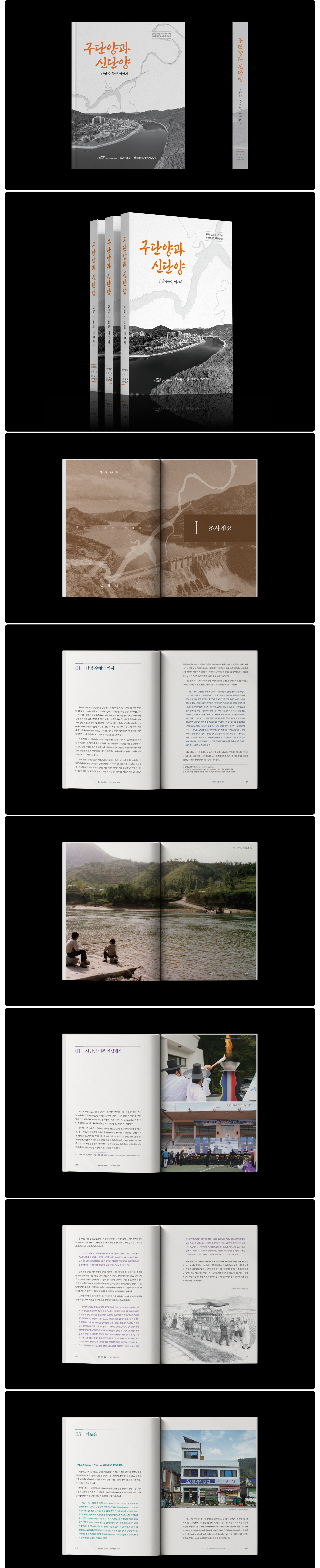 「구단양과 신단양 – 단양 수몰민 이야기」는 충주댐 건설로 인해 사라진 단양 지역의 마을과 삶의 흔적을 기록하는 데 목적을 두고 기획되었습니다. 편집디자인은 사진, 지도, 기록 자료를 중심으로 구성해 수몰 이전 공간의 모습과 기억을 차분하게 전달하는 데 집중했습니다. 전체 구성은 절제된 색감과 안정적인 레이아웃을 바탕으로 과도한 연출을 배제하고, 독자가 내용에 자연스럽게 몰입할 수 있도록 설계되었습니다. 장의 흐름에 따라 이미지와 텍스트의 비중을 조절해 읽는 리듬을 형성했으며, 과거 기록 사진과 현재의 풍경을 함께 배치해 변화의 시간을 비교할 수 있도록 했습니다. 이를 통해 개인의 기억과 지역의 역사가 교차되는 지점을 시각적으로 드러내고, 수몰민의 삶과 문화유적을 보다 입체적으로 이해할 수 있도록 구성했습니다.