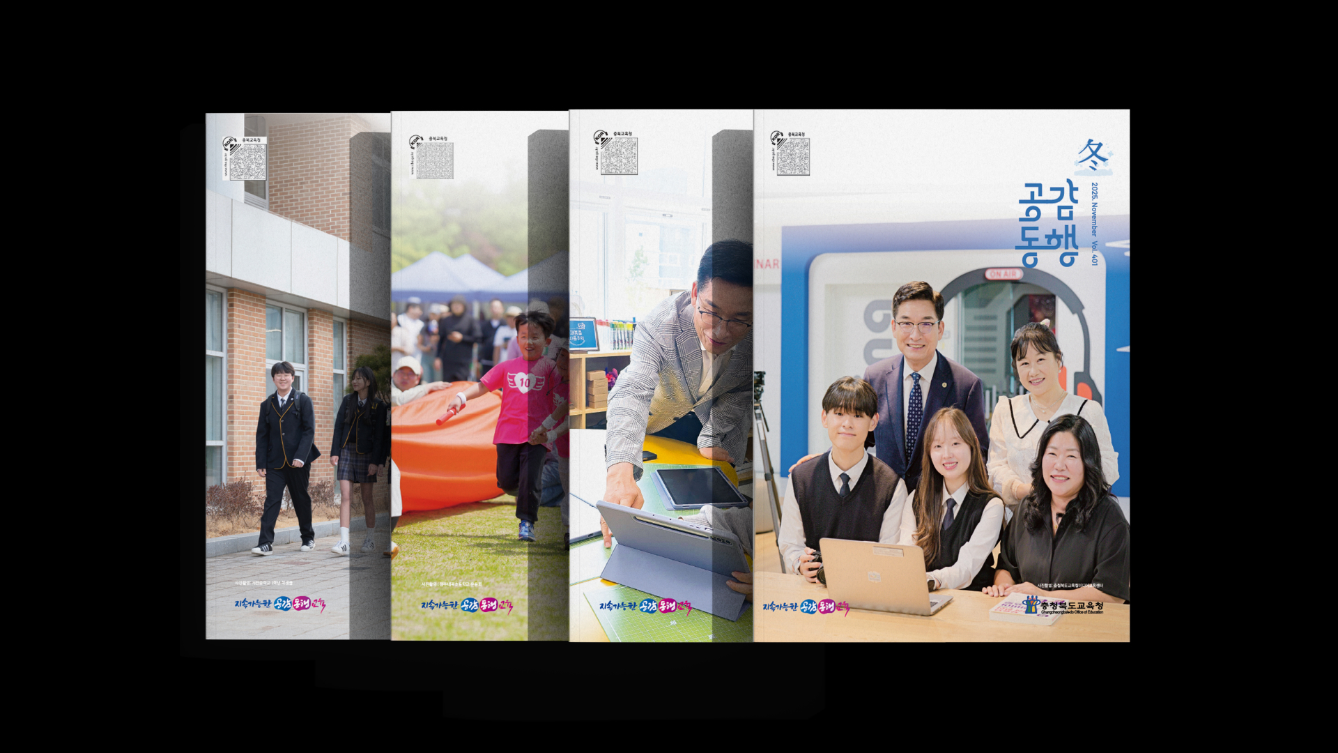 「충청북도교육청 2025 공감동행」은 충북 교육 정책과 현장의 다양한 이야기를 도민과 공유하기 위해 기획된 분기별 소식지입니다. 3월, 6월, 9월, 11월 각 시기의 주요 교육 이슈와 현장 활동을 중심으로 구성하였으며, 교육공동체가 함께 만들어가는 ‘공감’과 ‘동행’의 가치를 시각적으로 전달하는 데 목적을 두었습니다. 편집디자인은 실제 교육 현장 사진을 중심으로 구성해 신뢰감을 높이고, 정책 정보는 명확한 그리드와 컬러 구분을 통해 가독성을 강화했습니다. 표지는 계절성과 이슈에 맞는 대표 이미지를 전면 배치해 생동감을 살리면서도, 블루 계열의 안정된 톤을 유지해 공공기관 홍보물로서의 신뢰성과 일관성을 확보했습니다. 내지는 기사 성격에 따라 이미지와 텍스트의 비중을 조절해 읽는 흐름을 형성했으며, 인포그래픽과 강조 박스를 활용해 핵심 정책이 직관적으로 전달되도록 설계했습니다. 이를 통해 행정 중심의 정보 전달을 넘어, 학생·교사·학부모가 함께하는 교육 현장의 분위기와 성과를 균형 있게 담아내고자 했습니다.