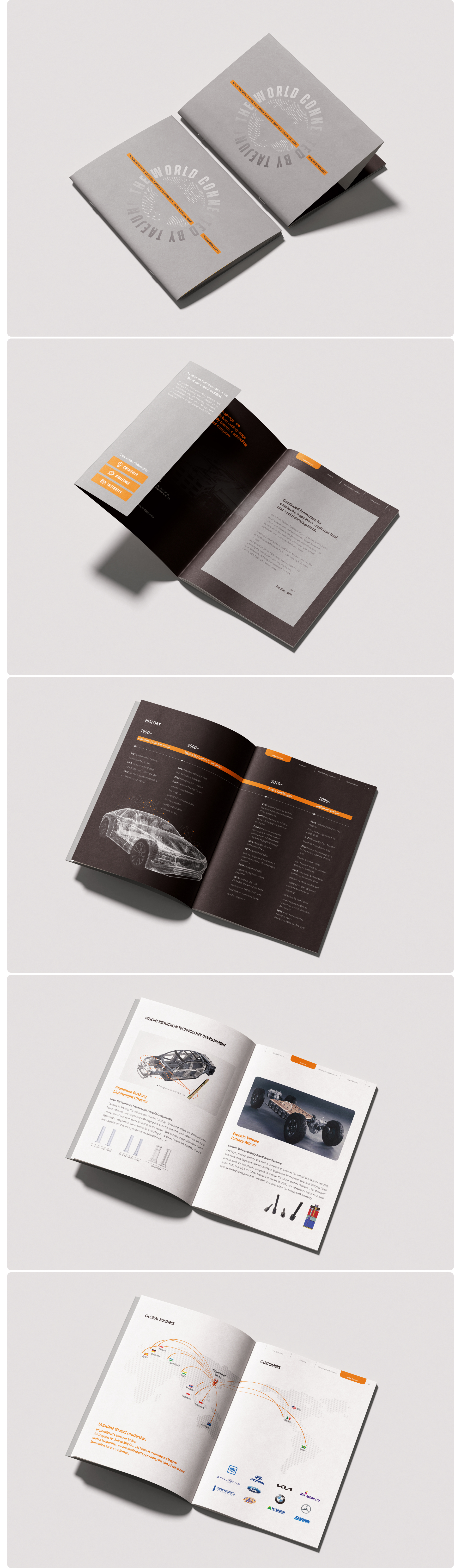 「태정기공 카탈로그」는 정밀 기계 부품 전문 기업의 기술력과 산업적 신뢰성을 효과적으로 전달하는 데 중점을 두고 디자인되었습니다. 전체 디자인은 화이트와 다크 그레이 중심의 절제된 컬러 구성을 기반으로, 오렌지 포인트 컬러를 활용해 핵심 정보와 기술적 강조 요소를 명확하게 드러내도록 설계했습니다. 표지는 간결한 타이포그래피와 중심 축을 이루는 그래픽 요소를 통해 기업의 전문성과 브랜드 아이덴티티를 상징적으로 표현하며, 내부 페이지는 기업 소개·연혁·기술력·제품 정보를 체계적인 그리드 레이아웃으로 구성해 정보 전달의 흐름을 자연스럽게 이어지도록 했습니다. 또한 자동차 구조 이미지, 기술 도식, 글로벌 네트워크 지도 등 다양한 시각 자료를 적극적으로 활용하여 산업 기술 기업의 전문성과 글로벌 경쟁력을 직관적으로 전달하도록 구성했습니다.
