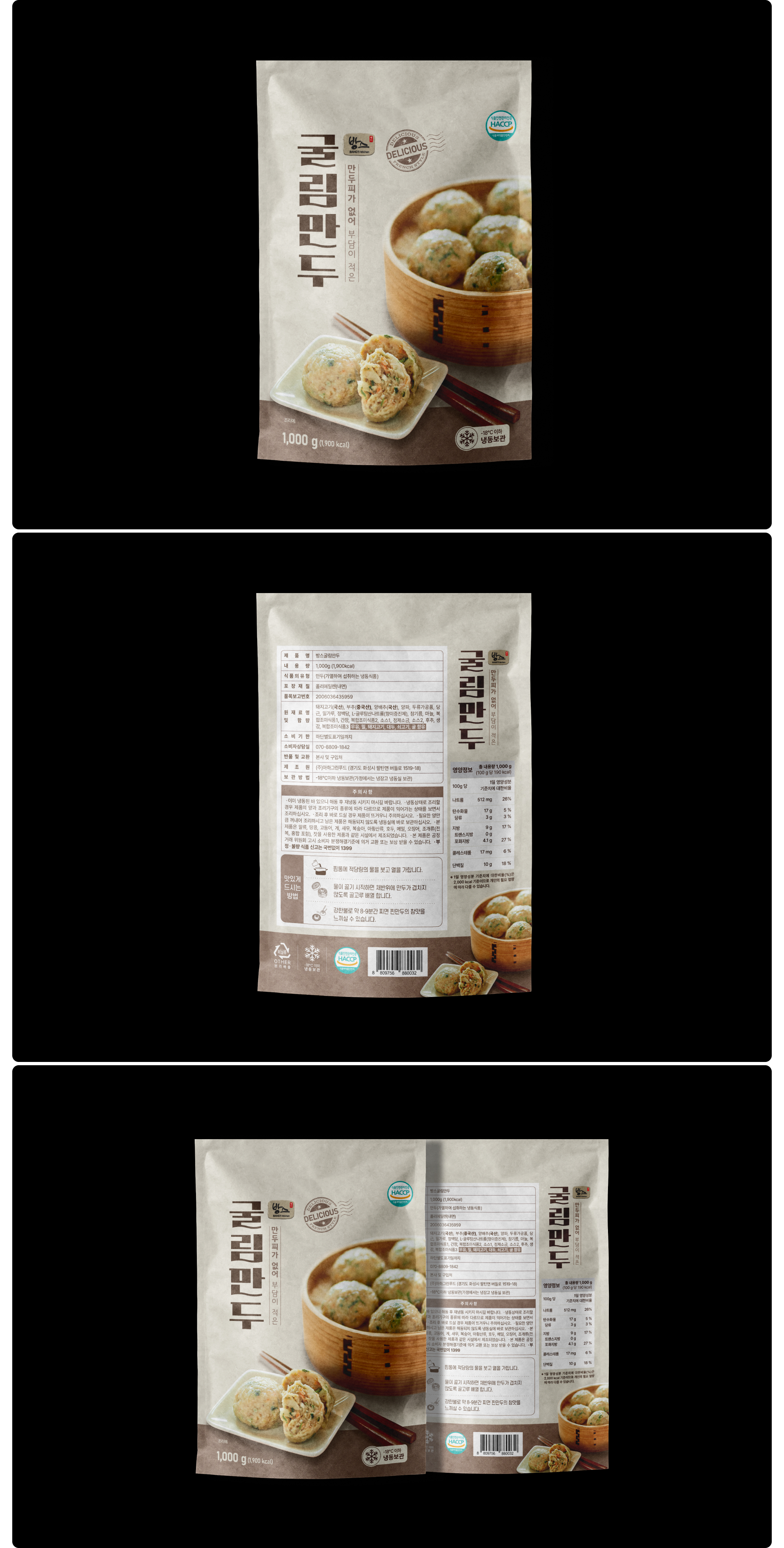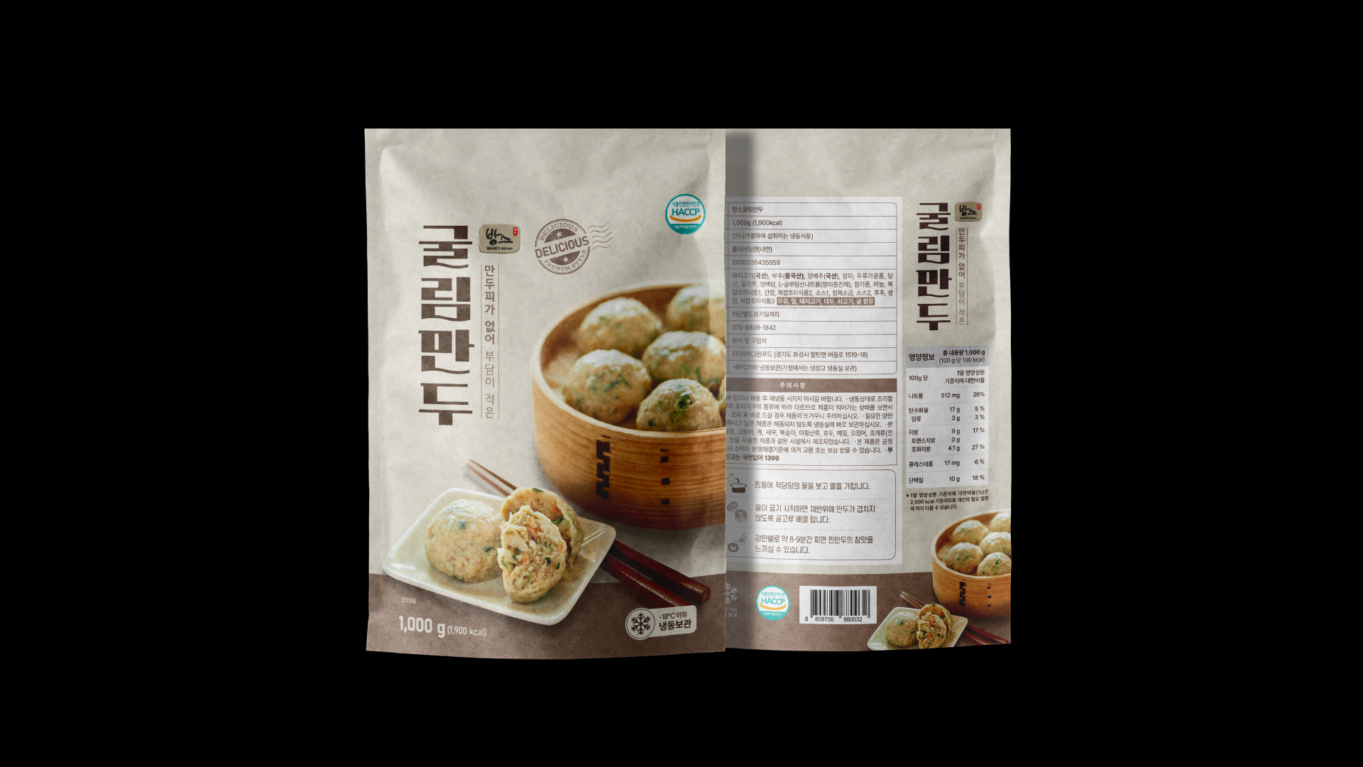 아하푸드의 굴림만두 패키지 디자인은 전통의 맛과 현대적인 감성을 조화롭게 담아내는 데 중점을 두었습니다. 상단의 화이트 배경과 하단의 브라운 컬러 배색을 대비시켜 깔끔하면서도 따뜻한 이미지를 형성하였으며, 깊은 풍미를 연상시키는 컬러 톤으로 제품의 정체성을 직관적으로 전달합니다. 중앙에는 제품명을 굵고 안정감 있는 타이포그래피로 배치하여 시인성을 높였고, 제품에 대한 신뢰감을 강화하였습니다.