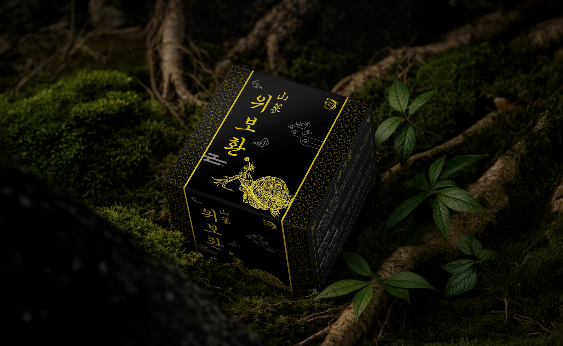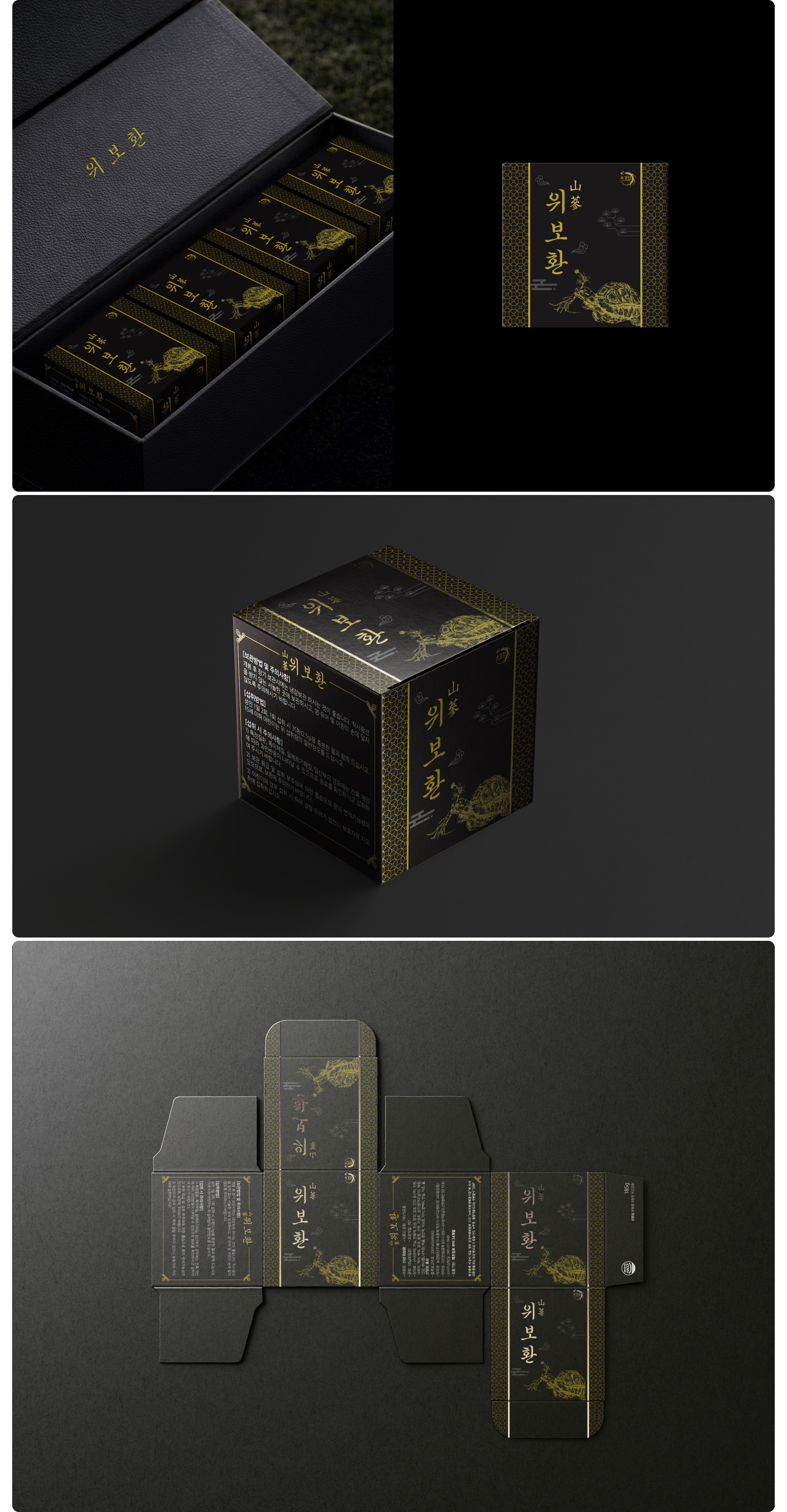 위보환 패키지 디자인은 전통 한방의 깊이와 신뢰감을 현대적으로 재해석하는 데 중점을 두었습니다. 전체적으로 블랙 컬러를 메인으로 사용하여 제품의 프리미엄 이미지를 강조하였으며, 골드 포인트 그래픽과 한방 원료 일러스트를 더해 고급스럽고 상징적인 인상을 전달합니다. 전면의 세로형 서체 구성은 전통 한약 패키지의 정체성을 살리면서도 정돈된 레이아웃으로 가독성을 높였습니다. 측면에는 제품 정보와 효능 설명을 체계적으로 배치하여 신뢰성과 전문성을 강화하였고, 패턴 디테일을 적용해 단조로움을 줄이면서 브랜드 아이덴티티를 완성하였습니다. 박스 전개도 기준으로도 그래픽 요소가 자연스럽게 이어지도록 설계하여 진열 시 일관된 시각적 완성도를 유지하도록 디자인하였습니다.