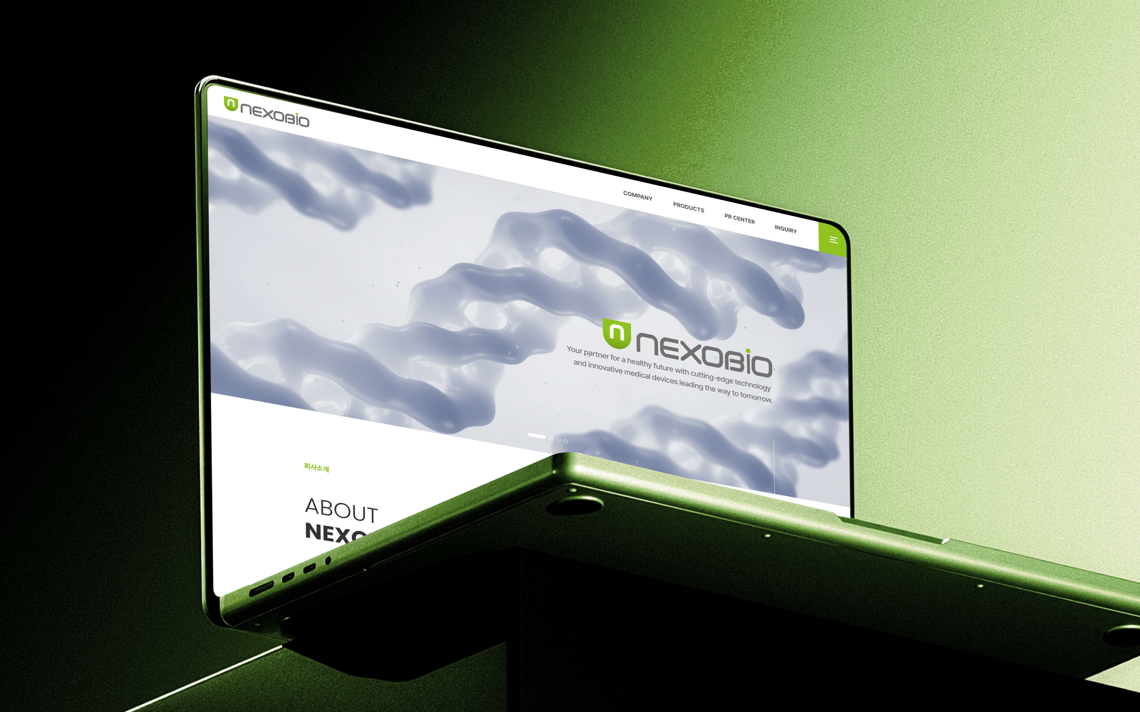 넥소바이오 웹사이트는 바이오·의료기기 기업의 전문성과 신뢰성을 효과적으로 전달하기 위해 클린하고 구조적인 UI/UX를 중심으로 설계되었습니다. 메인 비주얼은 유기적인 분자 구조 모티프를 활용하여 바이오 기술 기반 기업의 정체성을 직관적으로 표현했으며, 차분한 블루 톤과 포인트 그린 컬러를 조합해 첨단 의료 기술과 친환경 이미지를 동시에 강조했습니다. 전체 레이아웃은 정보 접근성을 고려한 섹션 분리형 구조로 구성되었으며, About, Product, News, Contact 등 핵심 콘텐츠를 명확하게 구분하여 사용자가 원하는 정보를 빠르게 탐색할 수 있도록 설계했습니다. 특히 제품 영역은 카드형 UI와 슬라이드 인터랙션을 적용하여 다양한 제품군을 직관적으로 비교·이해할 수 있도록 구성했습니다.